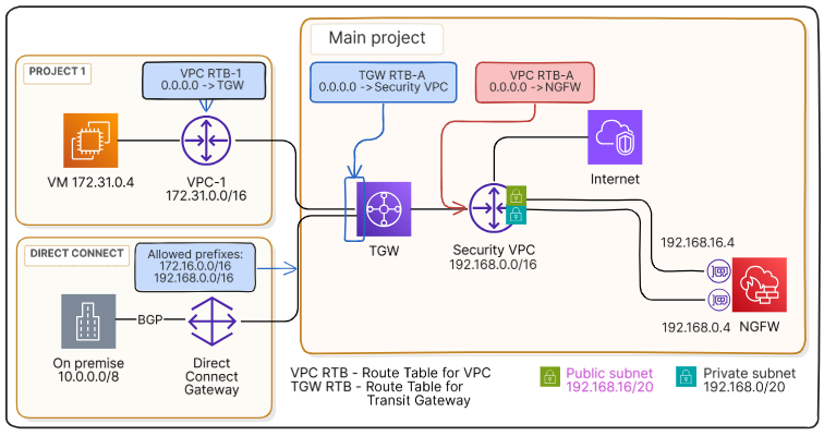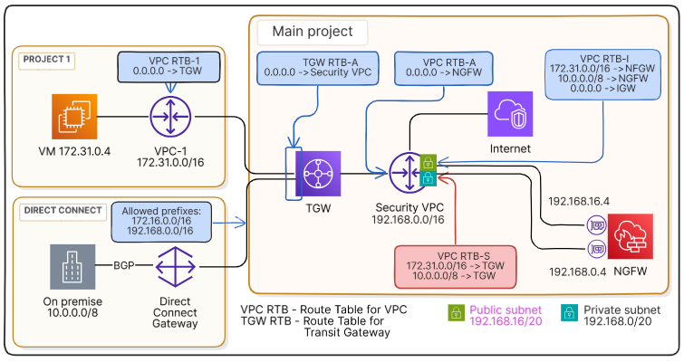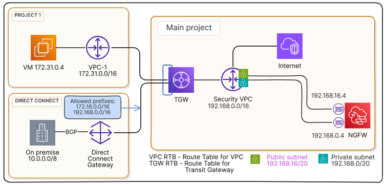 Весь трафик направляется для проверки в выделенное VPC (vpc-s, 192.168.0.0/16), в котором развёрнуто виртуальное устройство безопасности (NGFW).