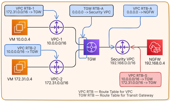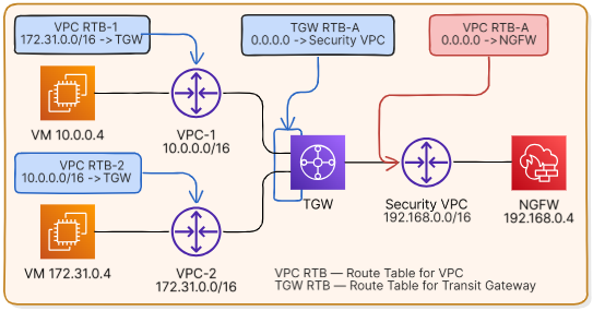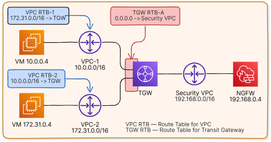 В приводимом примере весь трафик между двумя VPC — vpc-1 (10.0.0.0/16) и vpc-2 (172.31.0.0/16) — направляется на проверку на виртуальное устройство безопасности (NGFW) в третьем VPC для инспекции трафика (Security VPC) — vpc-s (192.168.0.0/16).