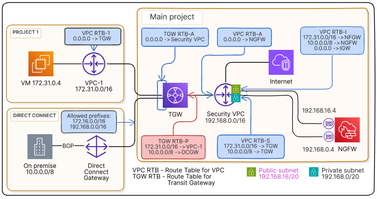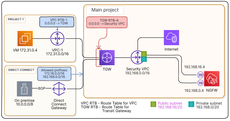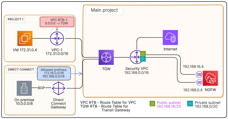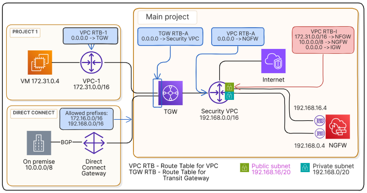 Весь трафик направляется для проверки в выделенное VPC (vpc-s, 192.168.0.0/16), в котором развёрнуто виртуальное устройство безопасности (NGFW).
